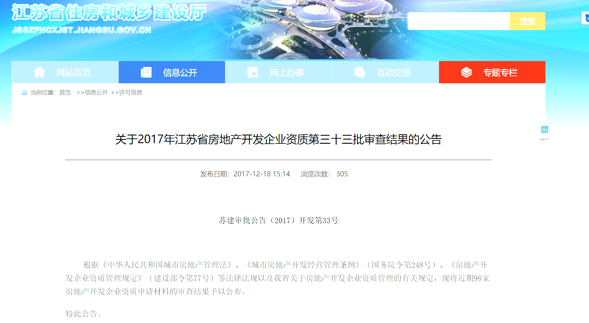2017年江苏省房地产开发企业资质第三十三批审查结果的公告